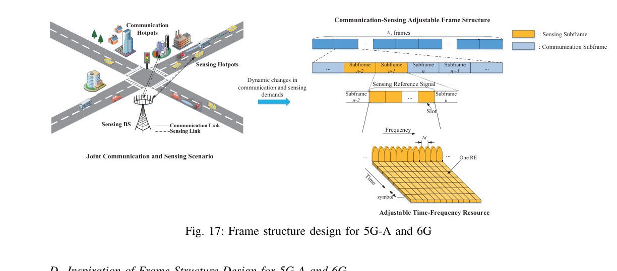 - Sensing subframe / Communication subframe: Proposed 5G-A/6G frame partition: designated slots for radar sensing (carrying SRS) and slots for data transmission.